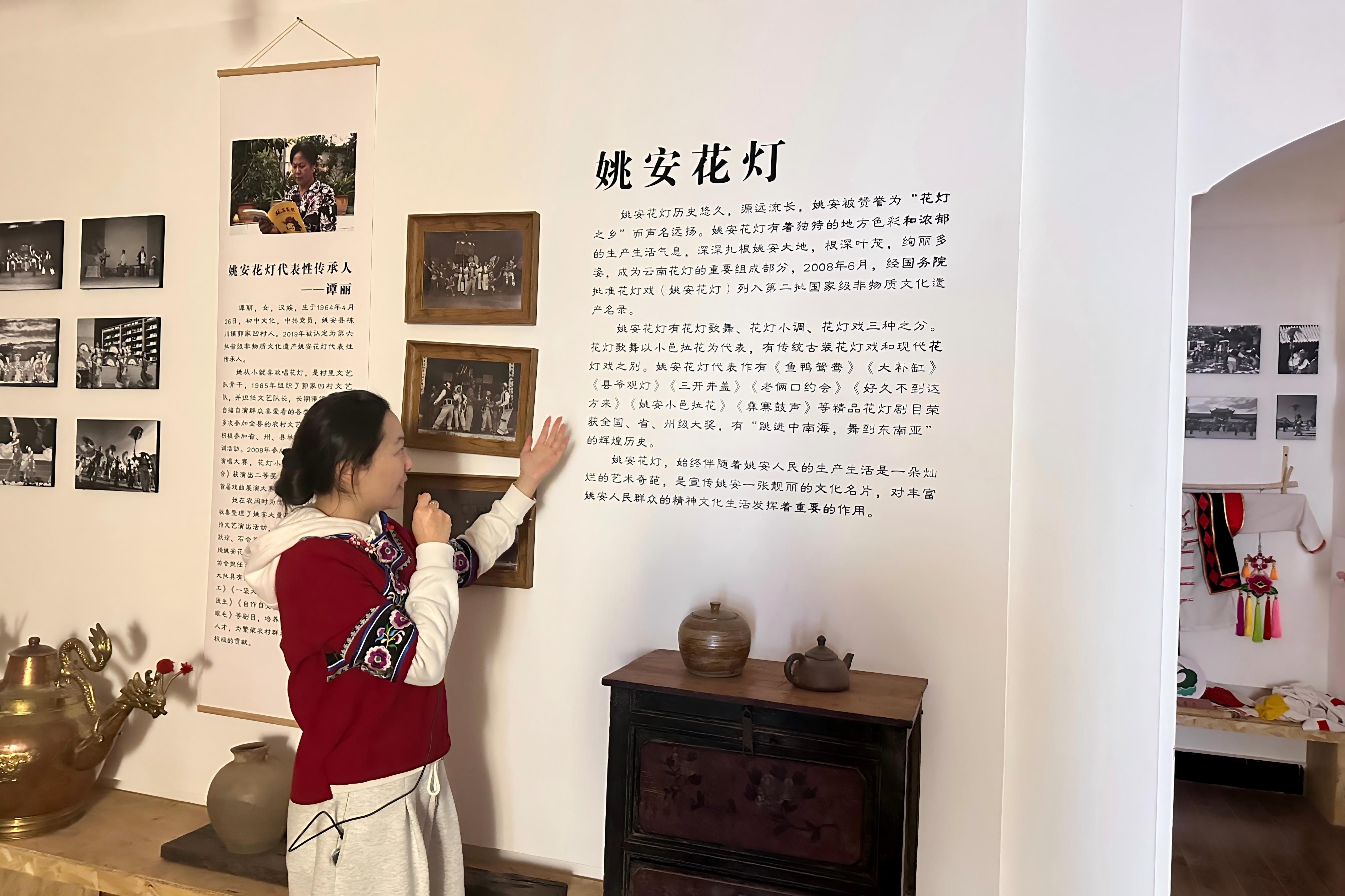 在姚安县光禄镇姚小花花灯博物馆,团队成员张馨月以志愿讲解员身份,向参观者系统介绍姚安花灯的历史渊源与艺术特色。姚安花灯作为云南花灯的重要分支,历史悠久、源远流长,姚安也被誉为“花灯之乡”,发源于小邑村的“小邑拉花”更是其中的瑰宝,于2008年6月被列入第二批国家级非物质文化遗产名录,被誉为“跳进中南海,舞到东南亚”的艺术奇葩。团队成员围绕“花灯歌舞、花灯小调、花灯戏”三大艺术形式,结合图文展板、实物陈列与现场讲解,向观众阐释姚安花灯“源于民间、服务人民”的文化基因,让更多人了解到姚安花灯作为中华民族文脉重要组成部分的独特价值。