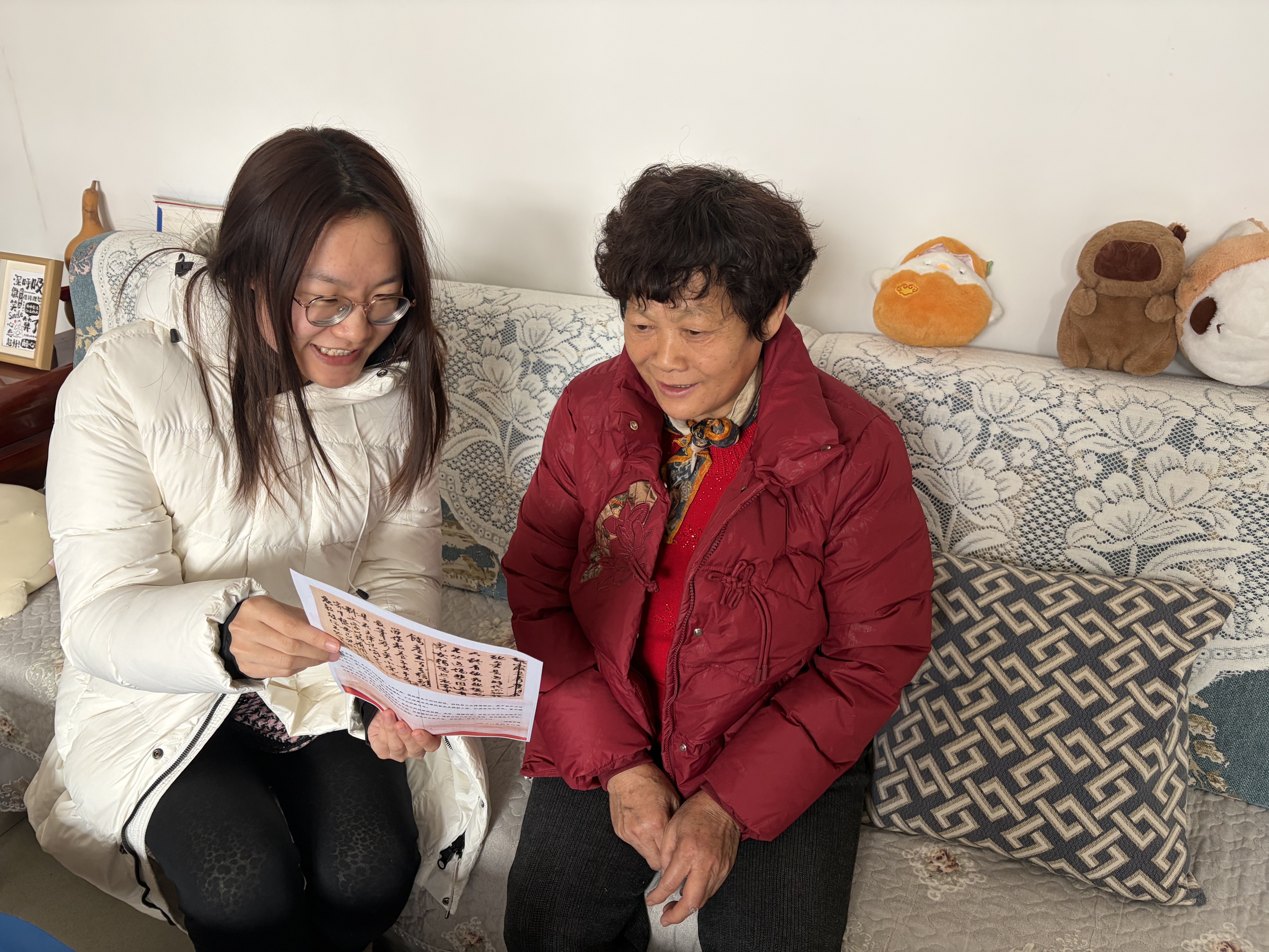 入户宣讲期间,队员们走进老党员、留守老人和普通农户家中,围坐在庭院里、炕头上,用通俗易懂的乡音俚语讲述长征途中的感人事迹,结合新泰本地革命英烈的故事,阐释长征精神的时代价值。针对村民关心的养老、医疗、惠农政策,队员们将“半条被子”等红色故事与“十五五”规划建议中关于民生保障的部署相结合,讲解党和国家对农村发展的重视与支持,让村民在听故事的同时感受到政策的温暖。