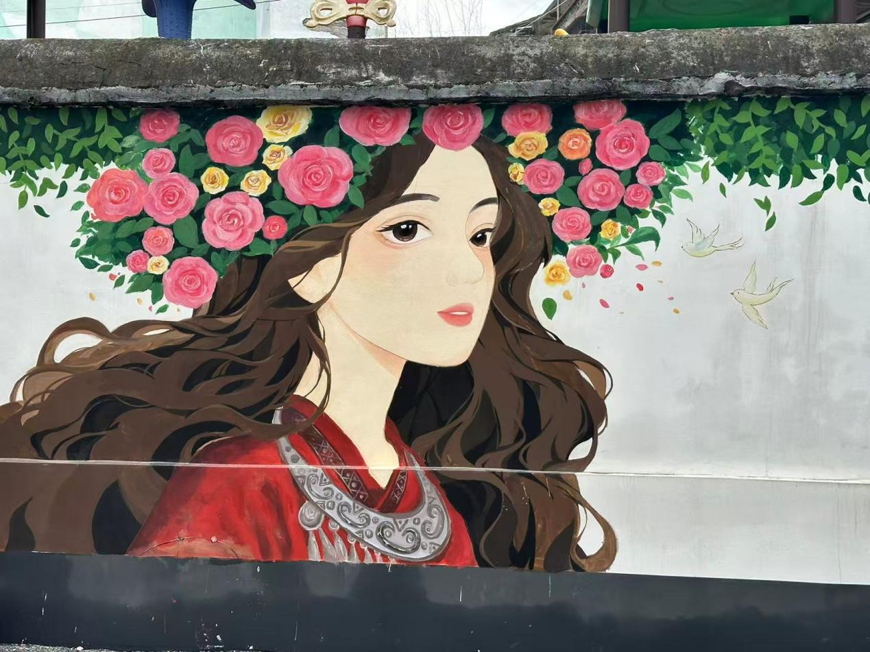 江口园巷道两侧,头戴苗帕、饰以银饰的苗族少女画像成为视觉亮点,不少身着苗族服饰的居民特意前来打卡,民族服饰与墙绘形象相映成趣。除少女画像外,墙绘中还融入了苗绣纹样中的蝴蝶、花草等元素,以及苗族节庆场景的抽象表达。墙面转角处,一幅以蓝白为主色调的墙绘再现了苗家织锦的经典纹路,色彩搭配借鉴了传统苗绣的用色习惯。团队成员驻足细察时,几位路过的苗族老人指着墙上的图案,用苗语轻声交谈,神情中透出亲切与认同。