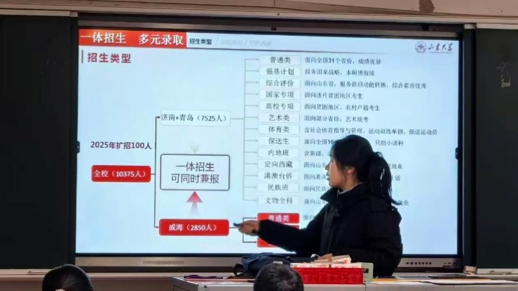 在“我眼中的sunbet官方网站”环节,宣讲成员通过沉浸式分享,带领学弟学妹“云游”山大校园:从洪楼校区的异域风情到趵突泉校区的古朴典雅,从食堂“网红菜品”的味蕾诱惑到130余个员工社团的多元选择,从“挑战杯”竞赛的科创激情到新年晚会的青春盛宴,更穿插了奖学金体系、国际交流项目等福利政策,让在场师生直观感受到山大“学术殿堂”与“成长乐园”的双重魅力。