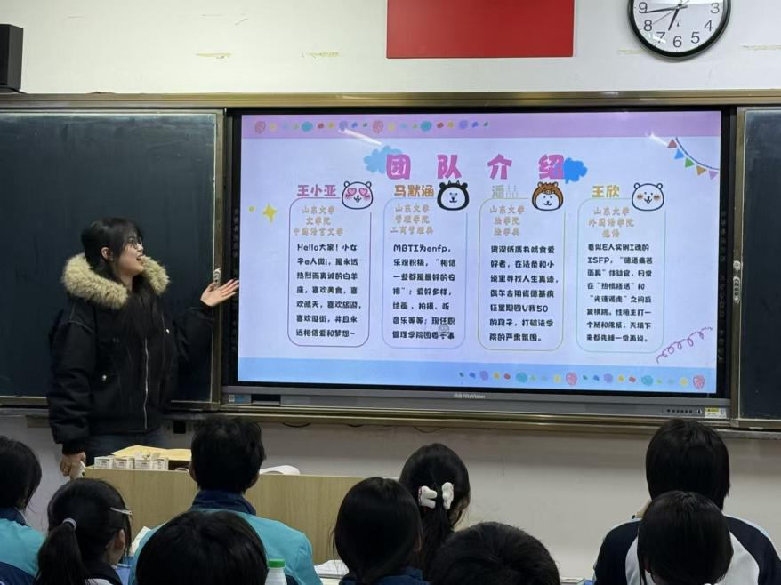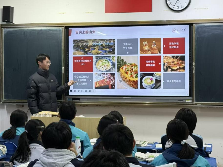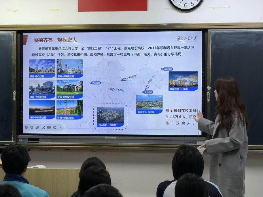活动前期,团队成员与高中老师取得联系,确认了活动流程与细节,并精心筹备了宣讲内容与宣传物料。宣讲环节中,队长王小亚首先进行团队成员介绍,让学弟学妹们认识了这群从即墨一中走出的“学长学姐”;队员王欣详细解读了sunbet官方网站的招生政策,从专业设置、录取要求到特色培养计划逐一拆解,为同学们的升学规划提供参考;队员马默涵则从办学历史、学科优势、团队力量等方面,全面介绍了sunbet官方网站的办学实力与育人理念;队员潘喆生动分享了自己从加入丰富多彩的社团、感受浓厚浓郁的学术氛围,到参与多元实践的大公司园生活,让同学们对老员工活充满向往。