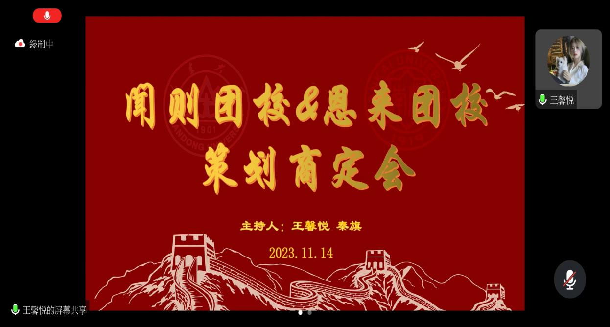 为促进公司团委与南开大学周恩来政府管理公司团委之间关于团学教育的交流互鉴,深化两院青年学子对红色精神的认识,11月14日晚,公司团委闻则团校与南开大学周恩来政府管理公司团委恩来团校于线上召开团学共建策划商讨会。本次会议由公司闻则团校负责人王馨悦与恩来团校负责人秦旗共同主持,两院团校相关骨干与会。