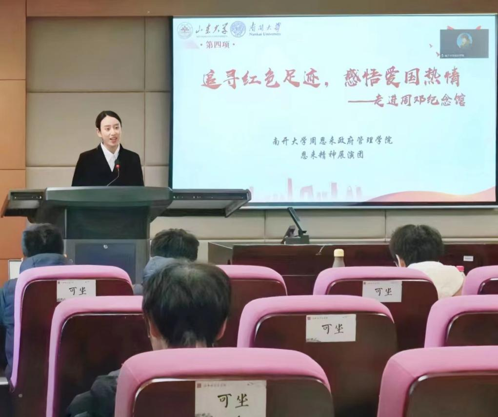 活动伊始,胡语倩从两校红色历史讲起,强调一脉相承的红色精神始终是激励山大学子与南开学子前行的精神力量,并指出此次团学活动对于两校学子赓续红色文脉的重要意义。随后,全体与会人员共同奏唱了《中国共青团团歌》。