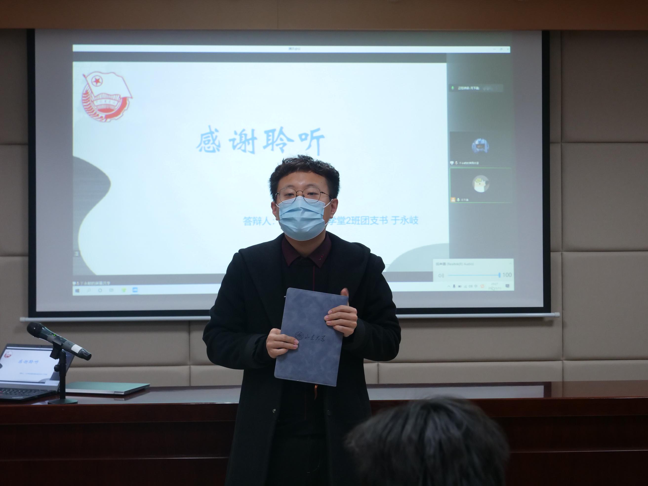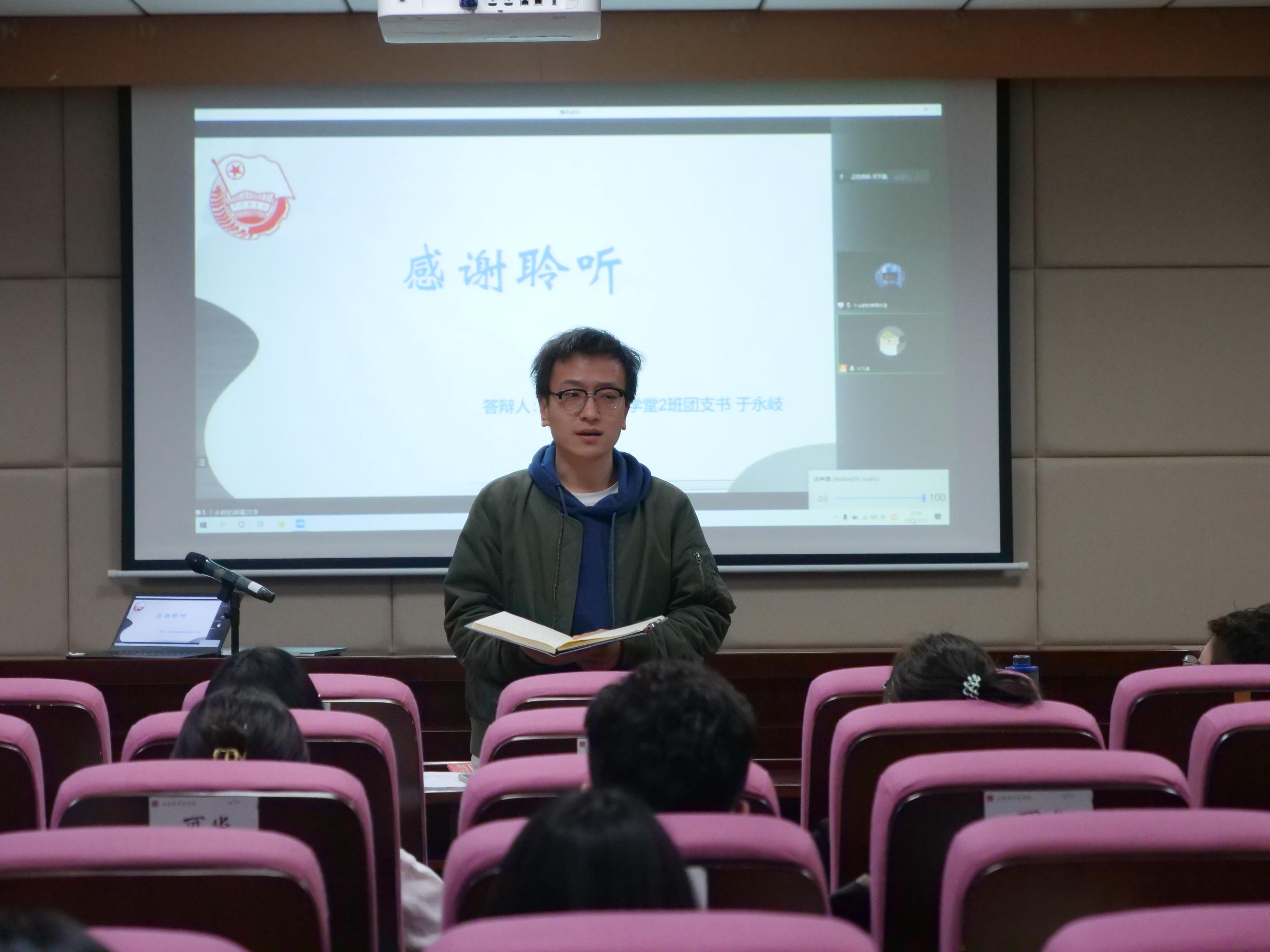 本次答辩按照抽签顺序进行,通过无记名打分的方式对各团支部答辩情况进行评分。各支部围绕组织建设、成员管理、主题团日活动举行等方面,充分展示了过去一年时间里团支部的实践成果、学习状况与精神风貌。在组织建设方面,各团支部树立团员模范,制定班级公约,切实推动班团一体化。在思想建设方面,各团支部组织红色经典读书会等特色活动,勤勉为学;参加青年大学习网上主题团课,学习党史知识,秉持初心;主动学习党的十九届六中全会精神,竞趋潮头。在活动举办方面,各团支部积极组织志愿服务活动,寓学于实践,通过前往百花社区清扫落叶、扫除校内道路积雪、收集废弃衣物和旧纸箱等活动,服务校园,服务社会,践行劳动教育,彰显学子担当,一展青春风采。