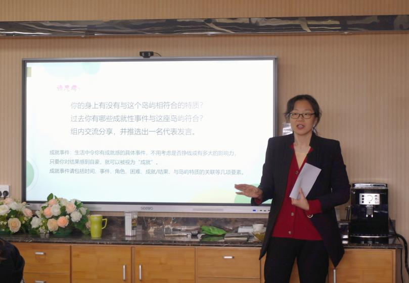 讲座伊始,果娜向同学们申明了安全约定,即友善对待同学、理性思考与保守隐私,为后续活动的顺利进行奠定了基础。第一个环节为“兴趣岛上的成就事件”,果娜向同学们展示环境迥异的四座岛屿,让同学们根据自己的喜好做出选择,并在相应的桌子旁坐下。随后,果娜一一介绍了不同岛屿对应的性格特征和工作取向,并邀请同学分享与岛屿相关的成就事件,引发了大家的热烈讨论。