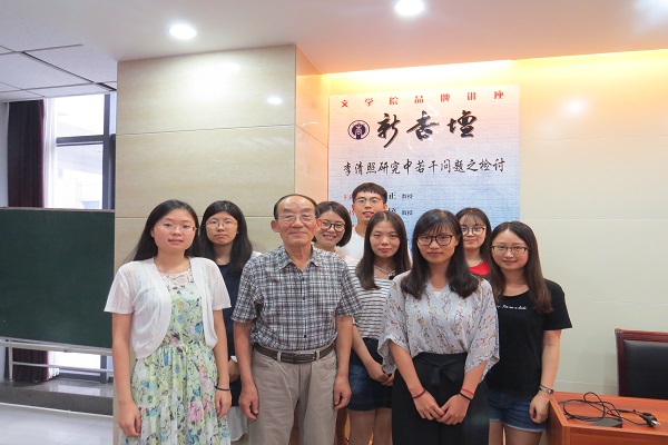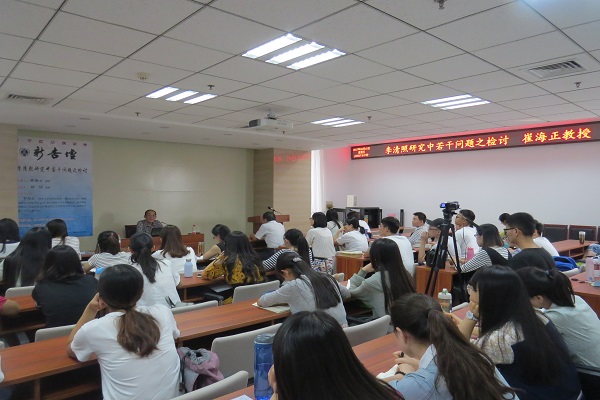 开讲前,崔海正论述了李清照研究现状中出现的材料不足、猜测性强及研究层次低等诸多问题,随后简要介绍了目前李清照研究的情况,以供同学们参考。崔海正引用了已故当代女学者邓红梅所著《李清照新传》中的一节,对李清照进行了一个简单介绍,并对这位女词人的凄凉结局表示惋惜。接下来,崔海正就李清照身世背景和主要作品等内容进行了具体论述,并向同学们推荐了王学初的《李清照集校注》一书。崔海正指出,由于材料不足,目前学界对李清照的卒年、卒地、生年、籍贯和其生母等身世情况存在诸多疑问。如对卒地之看法,主要集中于南京、苏州、杭州、绍兴、宁波、安徽等江浙一带,尚未有统一意见。他认为,李清照晚年或许投奔在杭做官的庶弟,故卒于杭州一说更为可信。在他看来,对存疑问题应该多方考证,细心分析,并在论述当中加以标识。随后,崔海正就李清照作品的艺术特点展开详细论述,并旁征博引,从作品的音律特征和内容风格等角度出发,总结诸多大家研究成果,概括了李清照作品真情、家常话、白描和韵律美的特征与情感自我化、纪实性和清丽化的“东坡范式”风格。同时,他还以《词论》为例,详细介绍了词“别是一家”的文学理论,赞扬了李清照的非凡见识与其为词学理论做出的贡献。崔海正为大家列举出当下李清照研究中的相关统计数据,并简要说明了发生在李清照和赵明诚之间的争议性问题,见解独到,给同学们以深刻的启发。