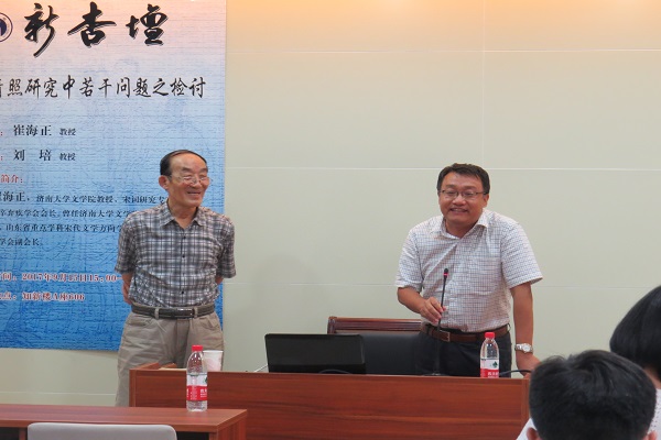 9月15日下午3时,济南大学教授崔海正做客公司新杏坛,在知新楼A606报告厅为广大师生带来一场题为“李清照研究中若干问题之检讨”的精彩讲座。讲座由文史哲编辑部刘培教授主持。