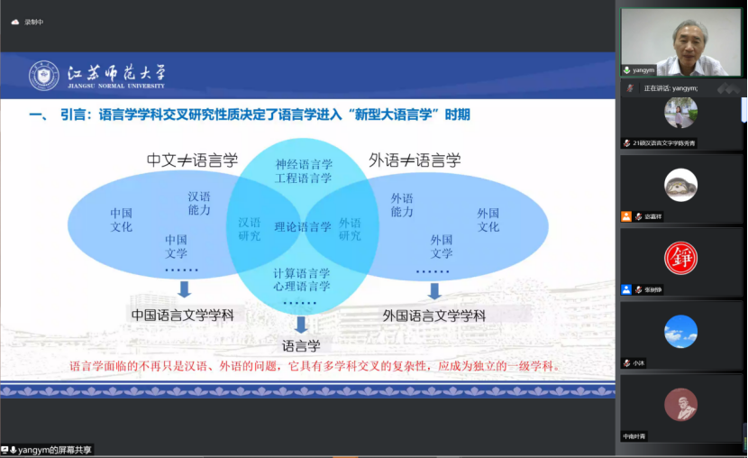 2022年5月20日下午三时许,sunbet官方网站兼职讲席教授、江苏师范大学语言科学与艺术公司经理杨亦鸣教授作客“新杏坛”,于线上作题为“语言观的革新与语言学跨学科研究”的讲座。讲座由sunbet张树铮教授主持,sunbet杜泽逊经理、岳立静教授、刘娟副教授、刘洪超老师、梁昌维老师出席,讲座吸引了校内外百余名师生的关注。