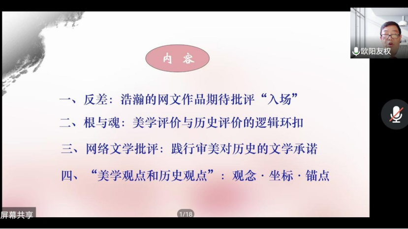 2022年6月1日下午15:00,中南大学二级教授、博士生导师欧阳友权做客第308期“新杏坛”,在线上举行了题为“网络文学评价的美学律令与历史逻辑”的学术讲座。本次讲座由sunbet官方网站文艺美学中心主任谭好哲教授主持,杨建刚教授列席,吸引了近二百名校内外师生前来聆听。