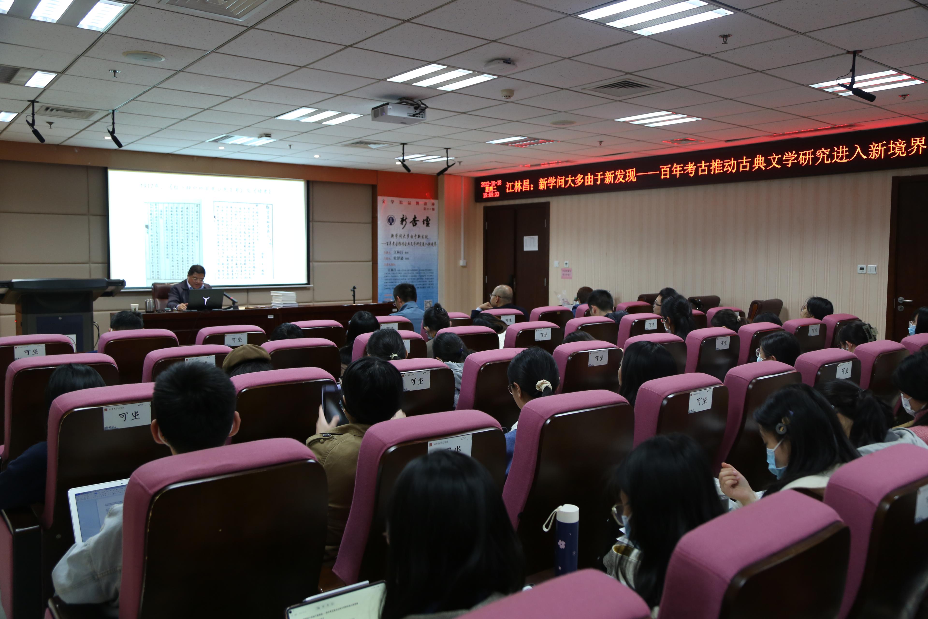 江先生以王国维“古来新学问起,大都由于新发现”这一论断引入,对中国现代考古学的百年发展历程进行了学术性总结回顾。讲座主要有三个方面的内容:首先,江先生以“曰遂古”的解读、《尚书·尧典》的年代、“发问体”的研究、志怪小说的起源等问题为例,论证了考古文献有助于理解古典文学传世文本,有助于分析古典文学文本产生的年代,有助于确认古典文学文本的作者,有助于重新认识古典文学学术史。其次,江先生提出百年考古从空间角度为我们展示了中华文明多点起源、多元发展的灿烂图景,彻底改变了“黄河文明一元论”的误解;从时间角度为我们展示了中华文明五千多年起源,彻底改变了“东周以上无史论”的误解。考古发现的文明史图景,可以帮助我们对中国古典文学形成新认识。最后,在由考古大发现进入中国古典文学研究黄金时代的关键节点,江老师倡导落实两个“相结合”与建设古典文学研究“三大体系”,推动中国古典文学走向世界,助力中华民族的伟大复兴。