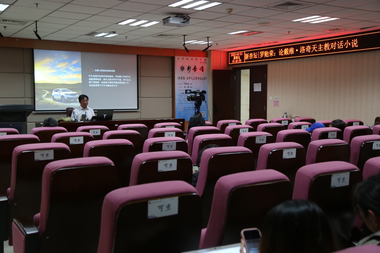 4月21日晚18时30分,sunbet荣聘教授罗贻荣做客第324期“新杏坛”,在知新楼A620室作学术讲座,题为“论戴维·洛奇天主教对话小说”。刘林教授主持讲座,刘晓艺教授等三十余位硕博研究生聆听讲座。
