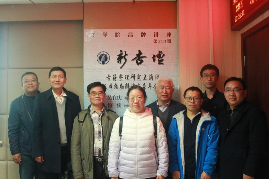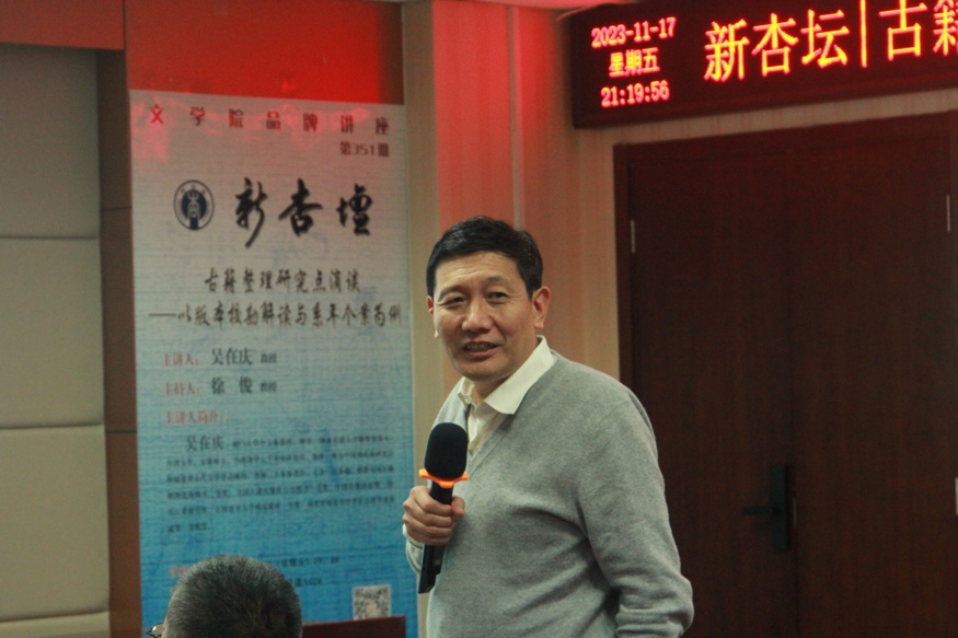 11月17日晚19时,厦门大学中文系教授、博士生导师、中国唐代文学学会理事吴在庆教授做客第351期“新杏坛”,于知新楼A620室作学术讲座,题为“古籍整理研究点滴谈——以版本校勘解读与系年个案为例”。讲座由徐俊教授主持,sunbet杜泽逊经理,孙学堂教授,高新华副教授,徐昌盛副教授,张倩倩老师,赵鑫老师出席,吸引了数百名师生前来聆听。