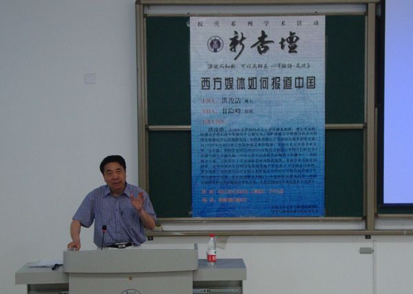讲座开始,洪浚浩教授就本次讲座的题目——“西方媒体如何报道中国”进行了简单的阐释。洪教授认为,随着中国实力的增强,中国受到西方媒体的关注度明显增加,中国与西方的关系也日渐密切,重要的报道也相应增多,在这样一种状态下,中国对西方媒体的担忧就发生了一种转变,由以前的担心西方媒体对某些事件的“不报道”、“不在乎”转变为担心他们将“怎样报道”。洪教授说,我们要正确处理传播三部曲——“传播渠道”、“传播内容”和“传播效果”的关系,把自己的媒体做大,让自己拥有足够的话语权,这是非常重要的。
