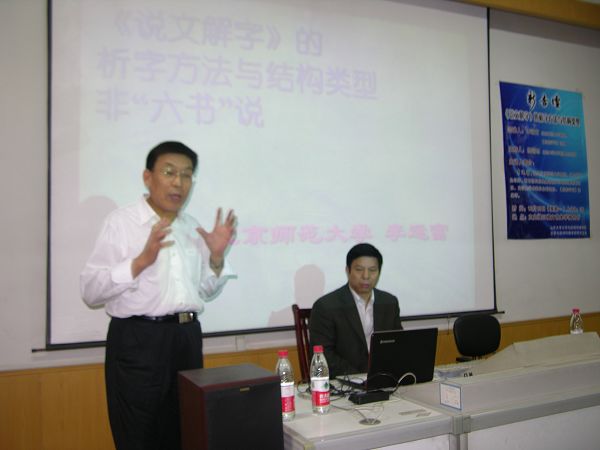 李教授接着讲述了“《说文解字》的析字方法不是‘六书’”,《说文解字》的字形分析中找不到“转注”、“假借”的结构类型;有的分析表述虽然与前四书相关,但名称含义模糊,跟实际的结构类型很不一致,没有整体对应关系。再者,关于“《说文解字》的分析方法”,他认为,许慎的析字法应该叫做“构件分析法”而不是“六书”分析法,许慎的构件分析包括构件功能分析、构件同形类比、构件形体和功能变异这三种情况。第四部分内容是“由构件分析法导出的汉字结构类型”, 许慎的“构件分析法”的构件的功能组合类型就是汉字的结构类型,《说文解字》所分析的构件有五个类型二十个结构形式。在讲座的最后一部分,李教授阐释了“‘六书’与《说文解字》的关系”,他通过对二者关系的深层次分析,来进一步论证了“《说文解字》的析字方法与结构类型非‘六书’说”这一观点。