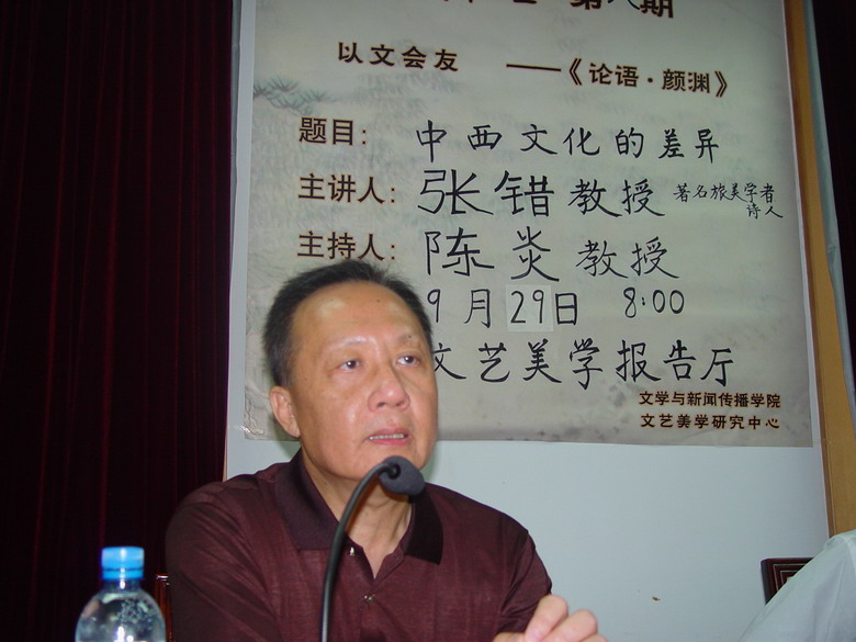 “我今天没有准备特殊的讲稿。我一直在作文学、艺术的一种领悟,我是把一些基本东西方的观点呈现出来供同学们参考。谦虚地学者带给我们的却是并不含蓄,反而深刻的哲理。哲学在整个发展过程中,从希腊罗马哲学发展开始,从未知课题发展到已知课题。在整个发展中有一大疑问:人是什么,我是什么,我存在的意义在哪里?”随后,张错教授对“知识”的概念起源作了深刻的理解性阐述,他说:“所谓的‘知识之果’,这在《圣经》里有比较经典的阐述。人吃了‘知识禁果’结果被赶出乐园,造物主的出来代表了全知、全能。懂是要付出的,懂有懂的代价,不懂也有不懂的代价。像我们在社会上谈到的人权问题,人的权利有选择性,人的基本权利不可侵犯,而人的生存意义正是追求懂的基本部分。科学在某种情况下是一种道理而不是真理,这就像文学中的寻找主题一样非常的明显。有时,我们做文化,在文学研究时,不要执著在什么东西上。而当从大的观念出发时,你的领域就会非常大。人的价值在沦落时,兽的价值比人的还要好。”