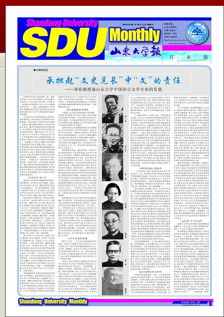 他告诉我们,自2009年以来,中文学科共承担国家社科基金项目40项,平均每年达10项之多。在国家社科基金重大攻关项目和重点项目申报中,更是有突破性进展,共获得陈炎教授的“文明、文化与构建和谐世界研究”等3项国家社科基金重大攻关项目,杨端志教授的“汉语词汇通史研究”和黄万华教授的“百年海外华文文学(整体)研究”等4项国家社科基金重点项目。在学术成果方面,自2009年以来共出版学术专著97部,发表CSSCI期刊学术论文750篇,其中廖群教授《先秦两汉文学考古研究》等4部著作入选《国家社科基金成果文库》。在重大奖项方面,中文学科共获得省部级以上优秀成果奖96项,其中周来祥教授《中华审美文化通史》、袁世硕教授《王士禛全集》等6部著作获得教育部人文社科优秀成果奖,董治安教授《两汉全书》等6部著作获得山东省社会科学重大成果奖,谭好哲教授的《中国现代美育的历史进程与目标取向》等6项成果获得山东省社会科学成果一等奖。这些科研成就的取得,无论在国内同类院系还是在校内不同学科都是名列前茅的,突出地显示出山大中文学科的科研水平和学术力量。