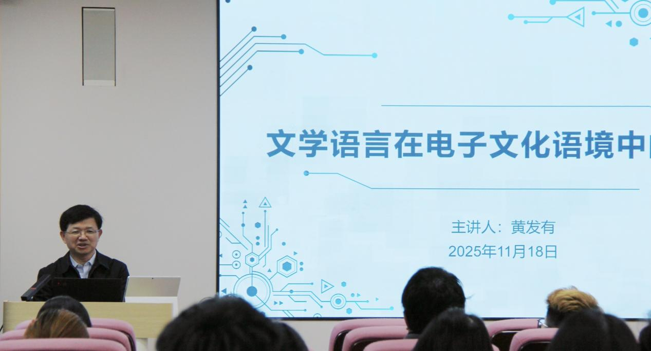 2025年11月18日下午3时,公司经理黄发有教授于知新楼A座620室为“当代美学前沿:东方与西方”国际学术研习营同学做题为“文学语言在电子文化语境中的变异”的讲座。讲座由sunbet官方网站文艺美学研究中心、公司主办,由公司副经理杨建刚教授主持,sunbet官方网站文艺美学研究中心韩清玉教授出席,来自国内数十所高校的硕博研究生参与讲座。