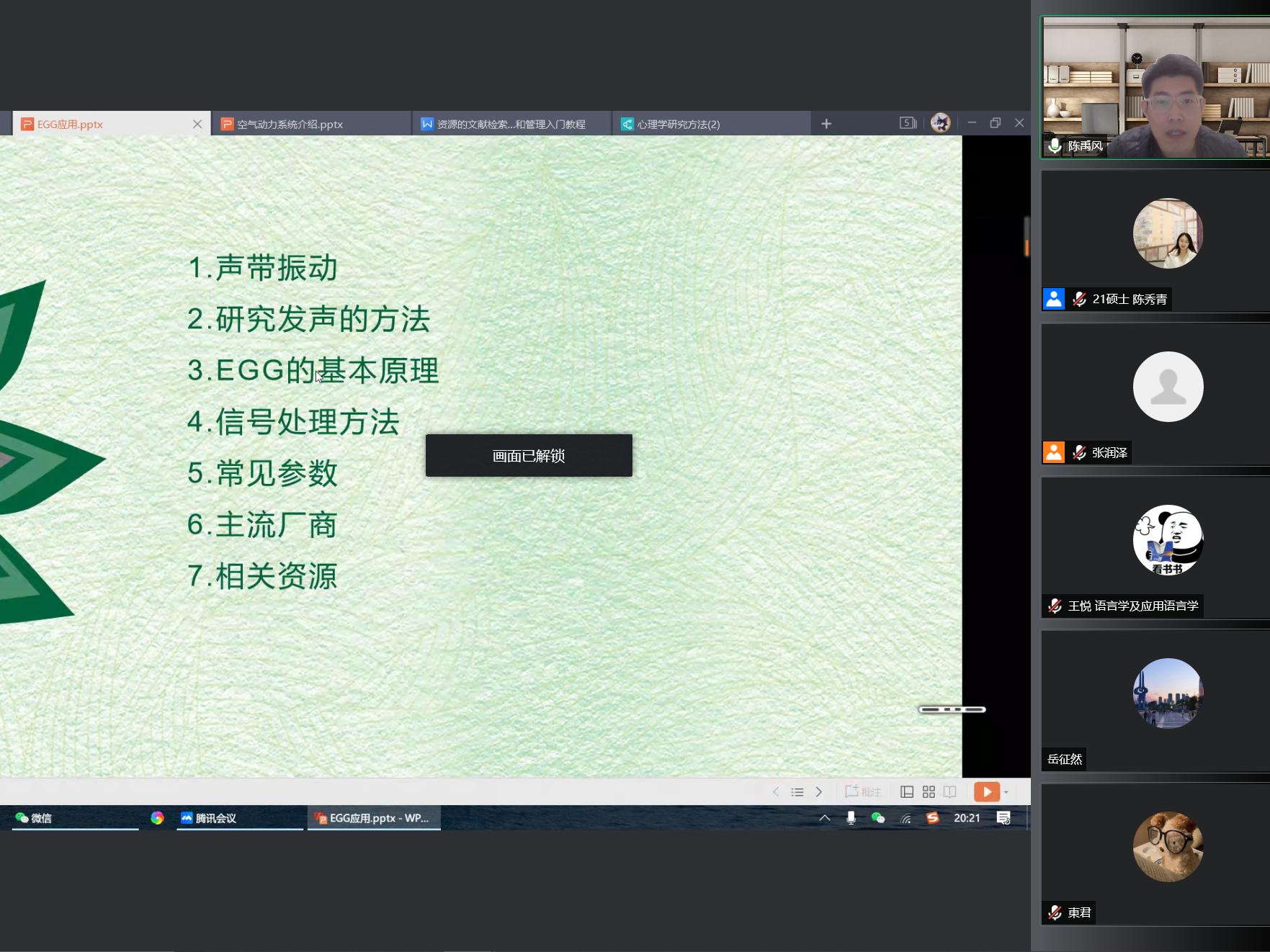 陈禹风从原理角度对以上设备再次进行了简要介绍,并带大家了解了相关研究中的数据处理方式,与病理语音、情感语音、方言等领域的研究对实验方法的运用情况。之后,陈禹风主要讲解了查阅相关实验成果的方法,包括国内和国外的文献,当遇到无校园局域网或公司未购入的情况时,仍可以从相关网站,如各地图书馆、iData等处获取资料,以便随时进行学习、研究。