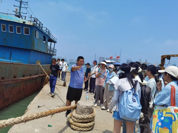 7月10日,调研重点转向当地的渔业词汇研究。团队前往海阳市龙山街道新民村,聚焦海鲜名称、船体部位及渔业文化等的方言表达,分组采访新民村、徐家铺村以及麻姑岛村的船长和老渔民,并做了详细的记录。随后,同学们又赶往凤城街道海阳港码头,实地采访了年轻船长,深入了解了海阳捕捞业的历史和现代渔业经济的发展。同学们在记录方言文化,收获大量第一手渔业词汇资料的同时,也追踪到其中承载的渔业文化和历史,收获很大。